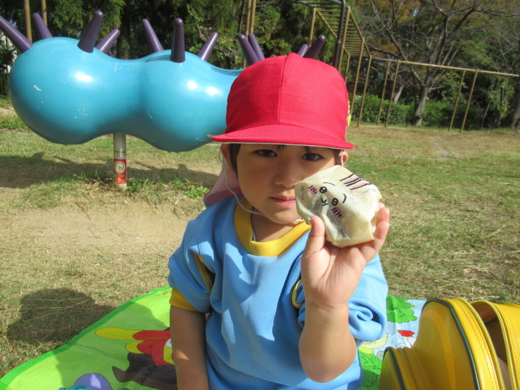 して隣りのさくら公園へお引っ越し。楽しみにしていたおにぎりとおやつの時間です(^^♪