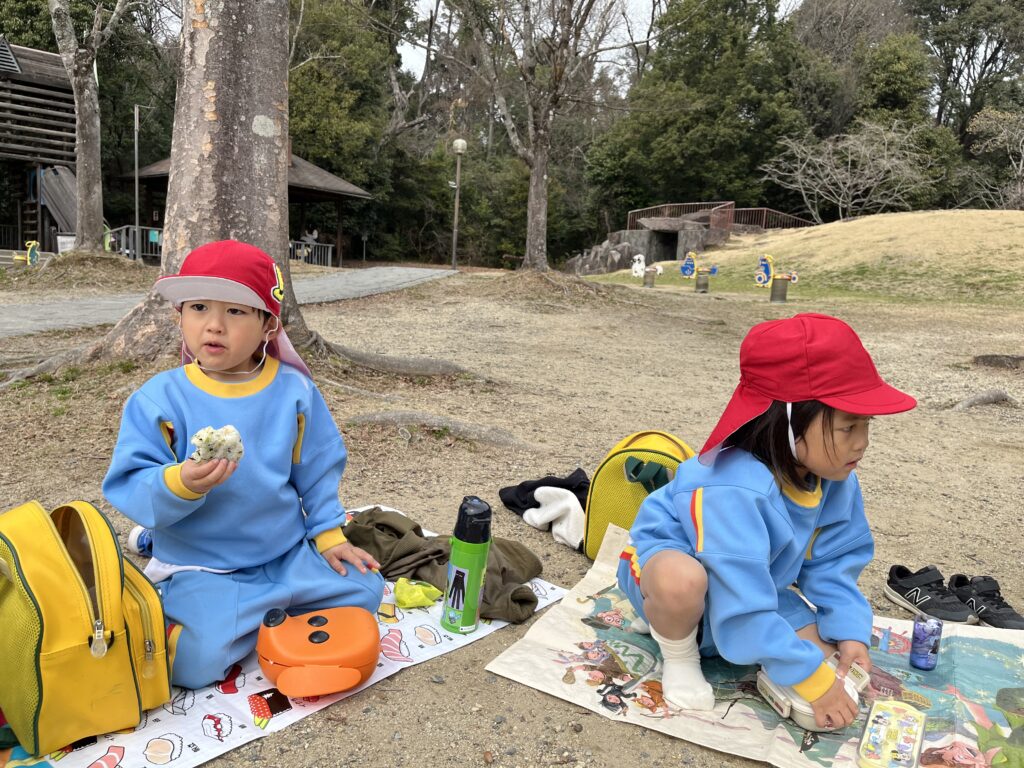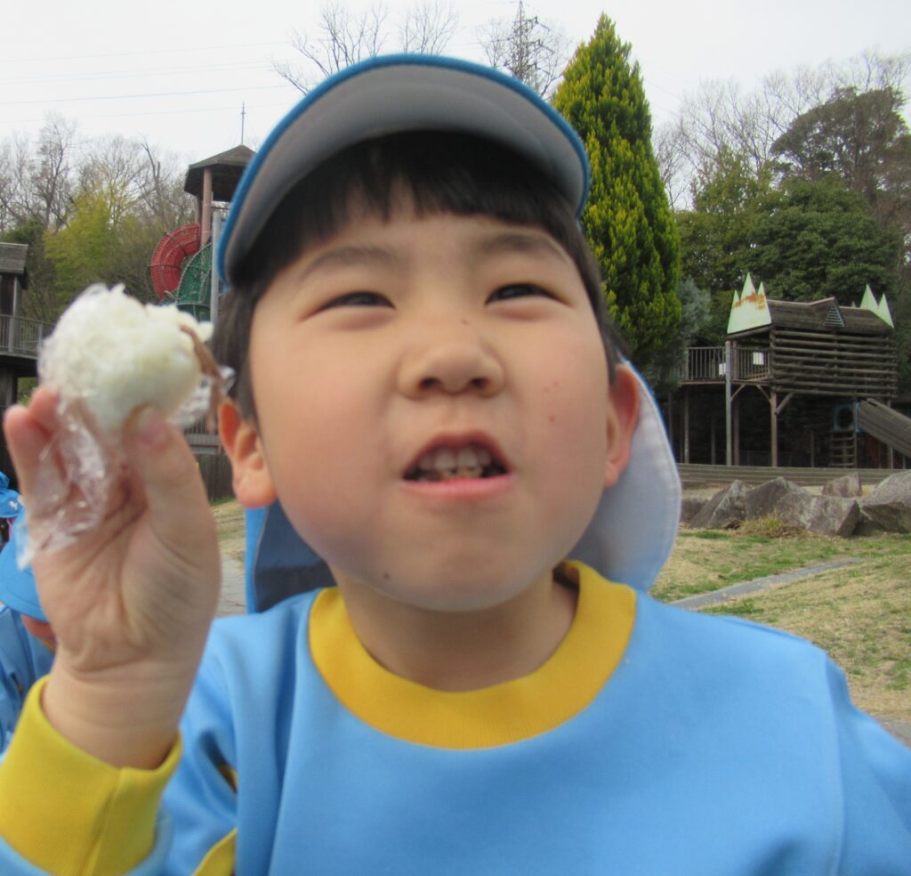 たくさん遊んで、お腹もグー!! 美味しいおにぎりとお菓子をいただきました。外で食べると、さらに美味しくなるよね~🥰
