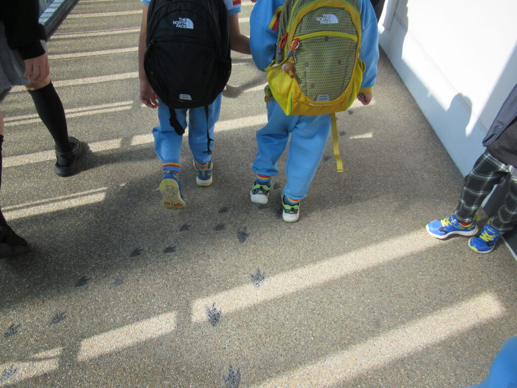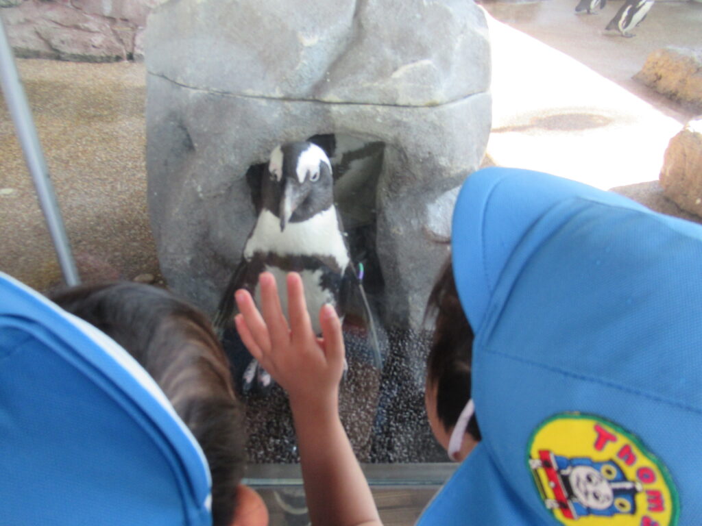 ペンギンを見ながら2階へ!「あそこのペンギン喧嘩してる!」「ずーっとこっちみてるなぁ!」「家の中で卵温めてるのかな?」など思ったことを友達や教師と伝え合います。