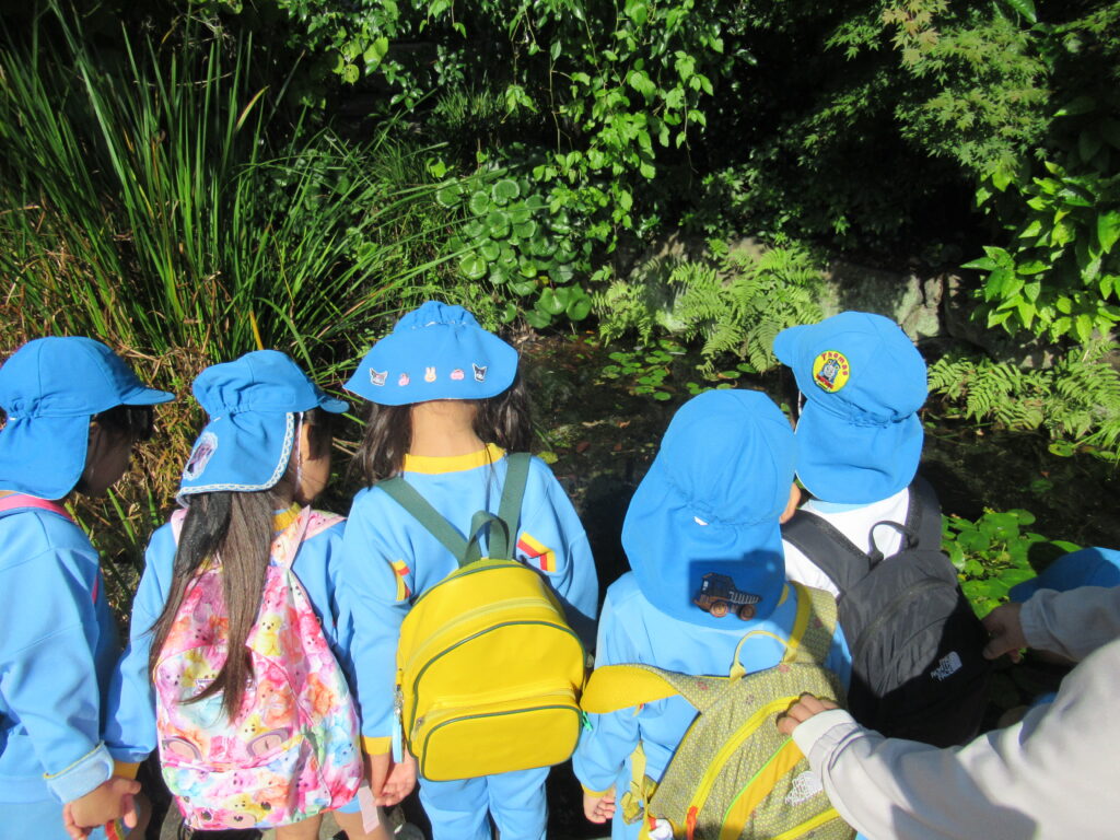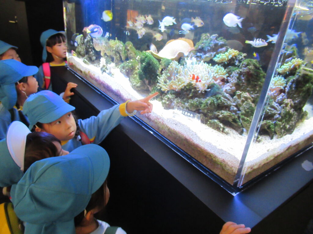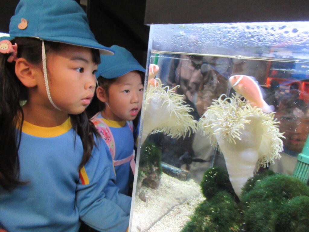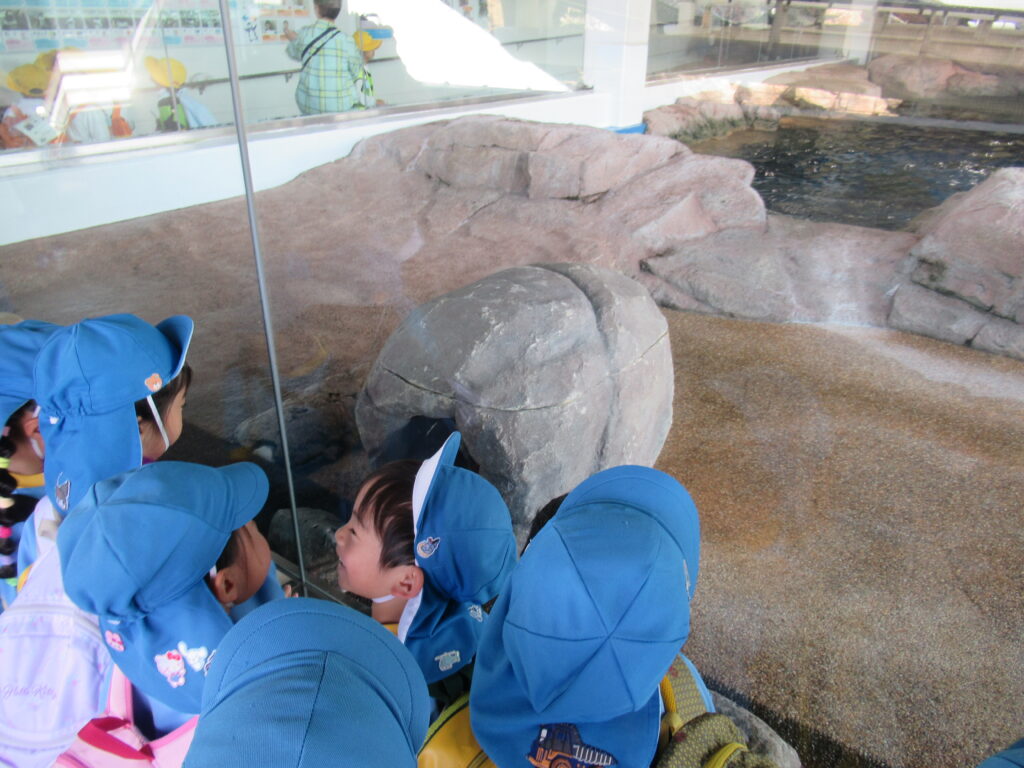 10月27日(月)に、さくら組が京都水族館への遠足でした。「おにぎり、3つも持って来た!」「おやつ、おにぎりせんべえ持って来てんで!」と友達と伝え合いながら楽しみにする姿が見られました。公共の場での約束事を確認して、館内へレッツゴー!!早速、大きなオオサンショウウオにびっくり👀