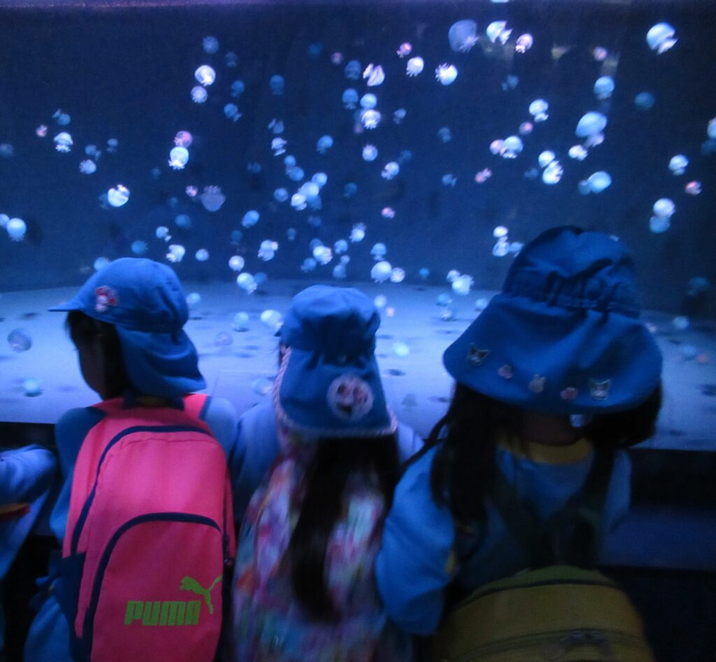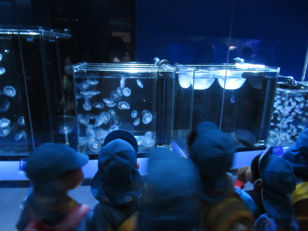 次は、クラゲコーナー✨ ここからは暗いから2人組の手は絶対離さないでねの約束をして回りました。「すごい綺麗!!」「赤ちゃんのクラゲ、かわいい~!」「暗いからクラゲが光ってるね!」「毒あるねんで!!」と。