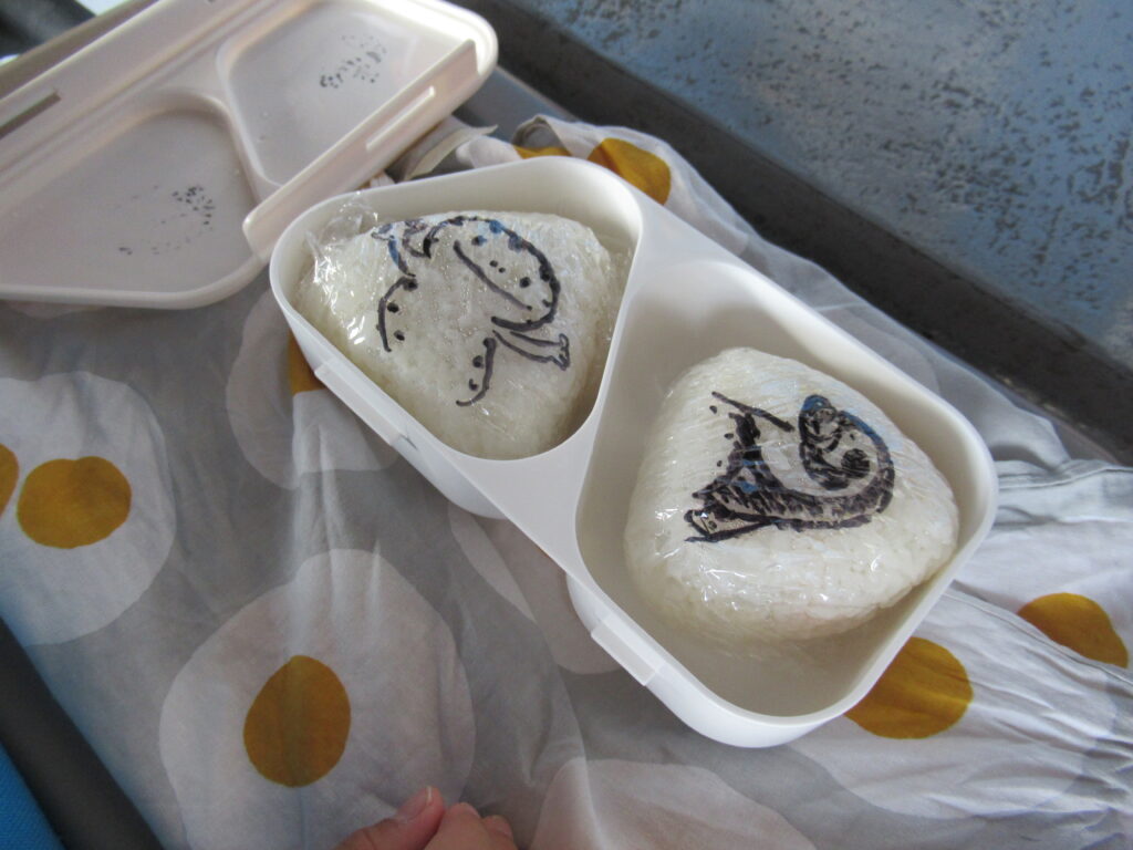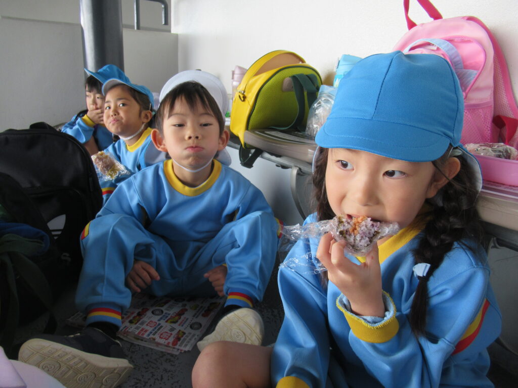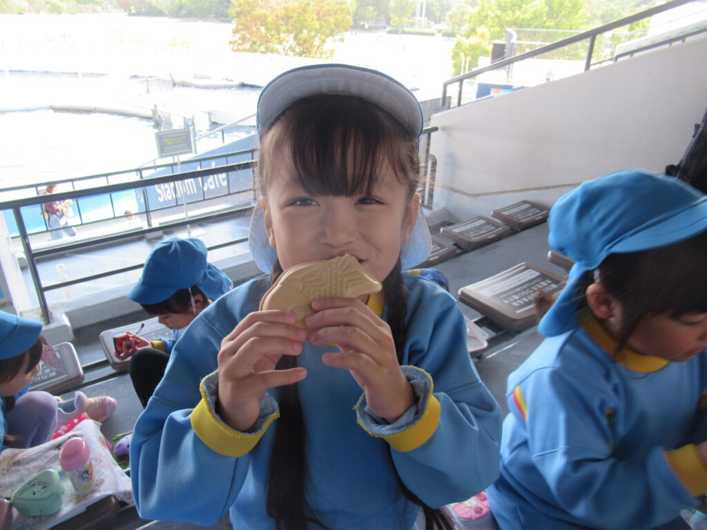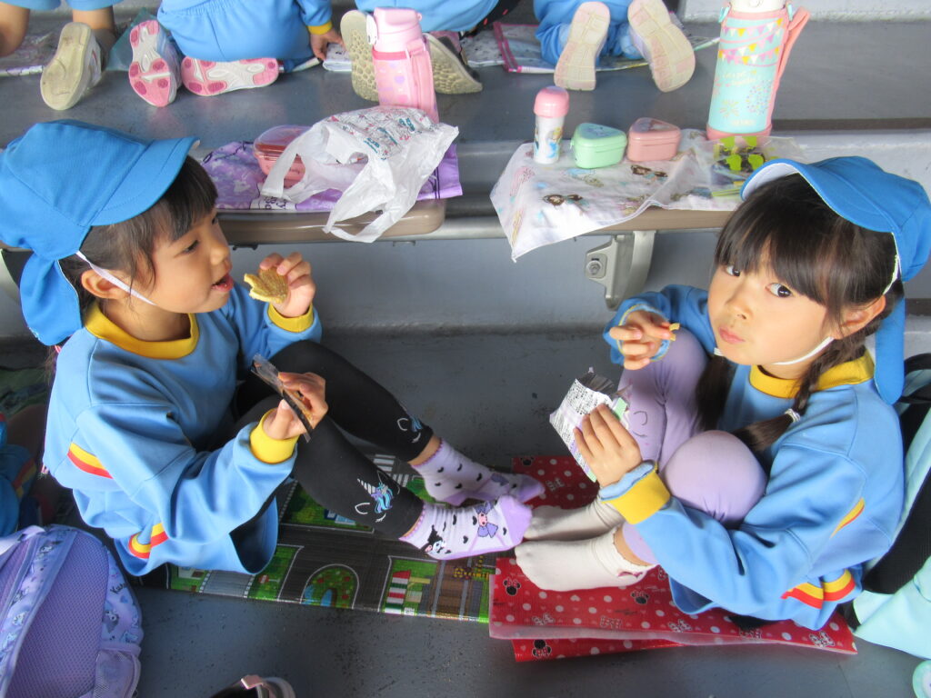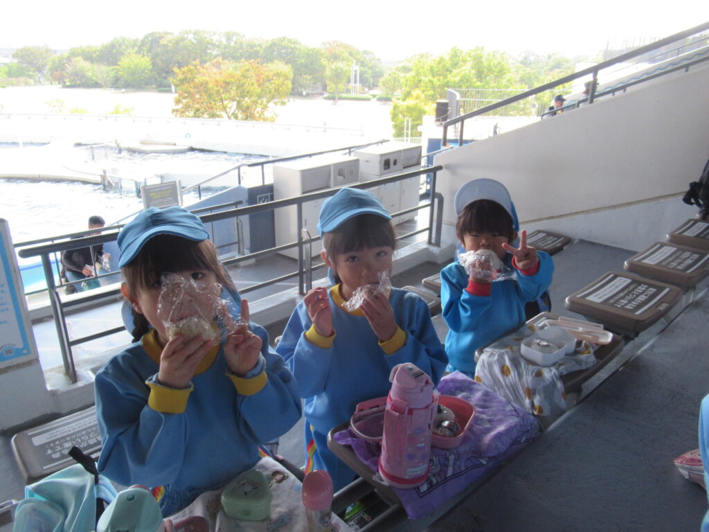 イルカショーを見た後は、昼食・お菓子タイムです🍙🍪 おにぎりの具を見せ合いっこしながら、「おいしい~」といただきました。