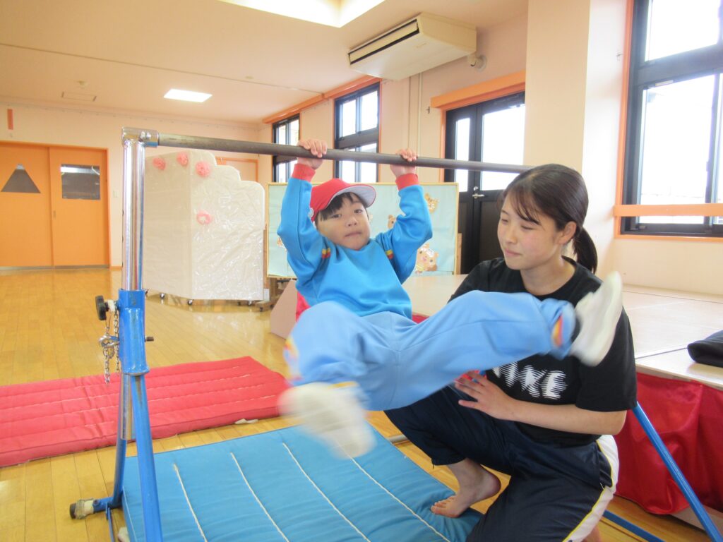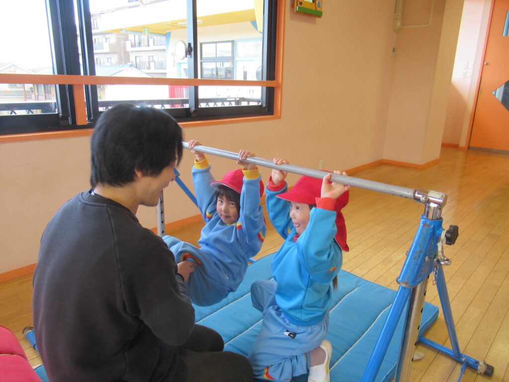 鉄棒で前回りができたり、縄跳びに興味を持って、自由あそびの時に自分で練習したり、