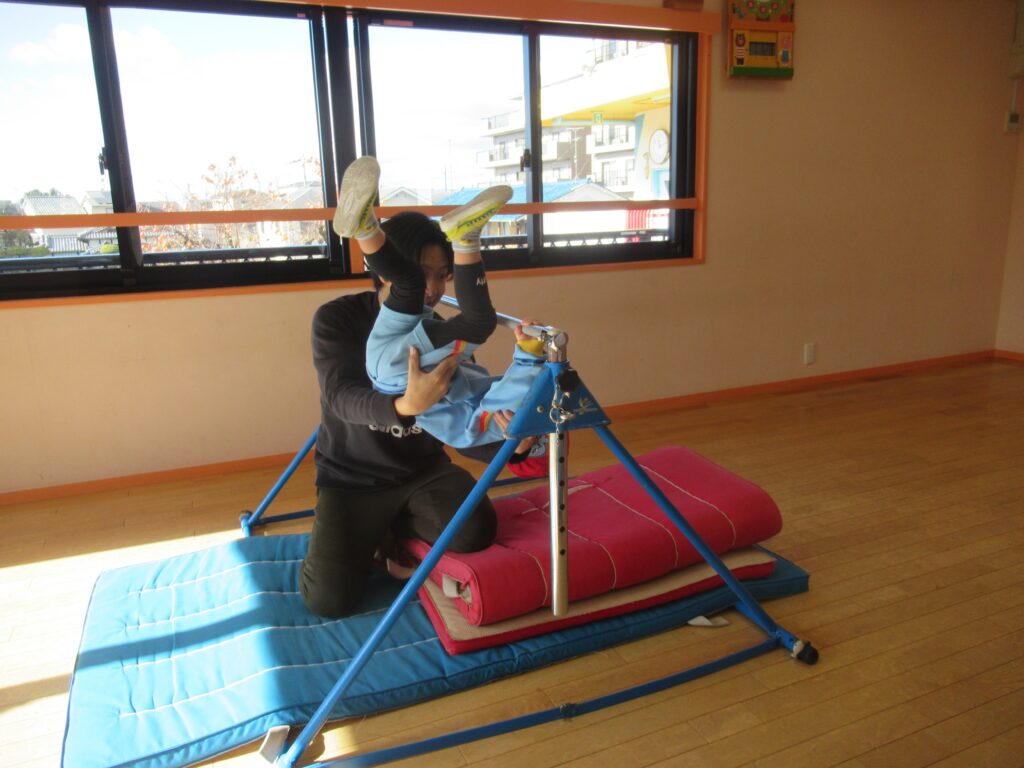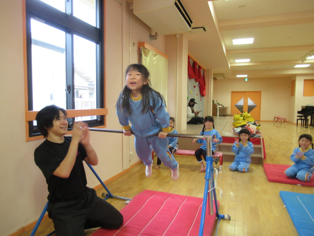 毎月、跳び箱・鉄棒・縄跳びなどのカリキュラムで、体操の先生に楽しく