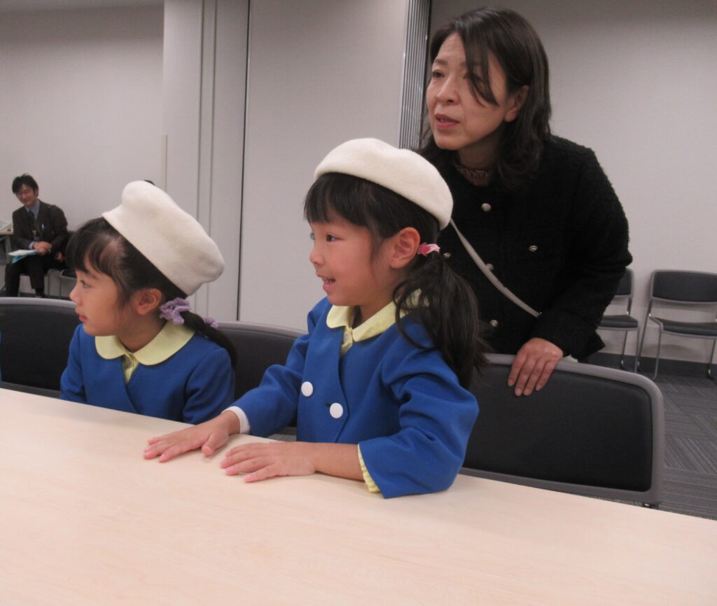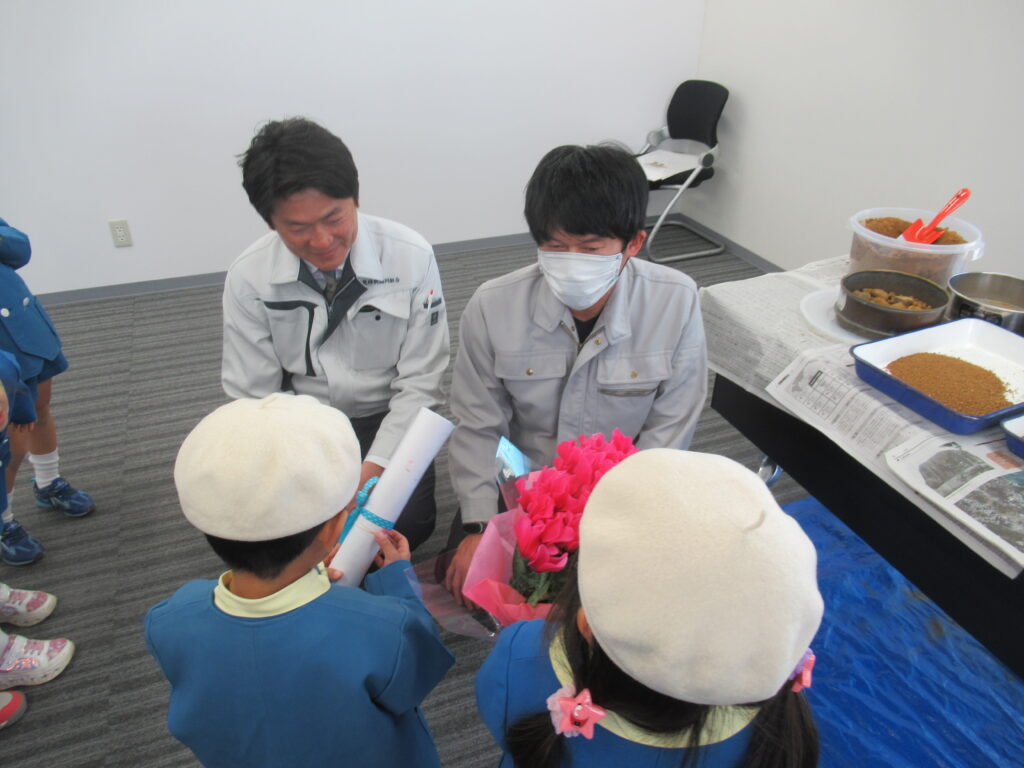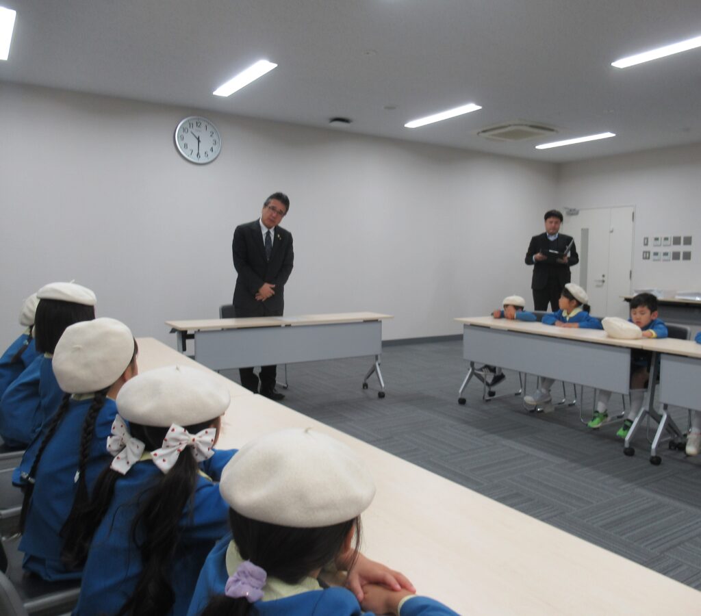 「市役所は、どんなお仕事をするところですか?」「市長さんの好きな食べ物はなんですか?」「好きな花はなんですか?」などなど、ちょっぴりドキドキしたけれど手を挙げて質問しましたよ。市長さんは、「お寿司」「桜」「赤色」が好きということが分かりました。