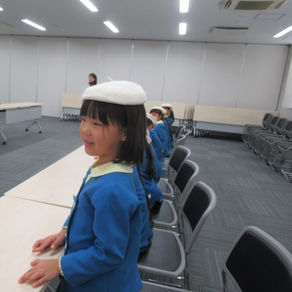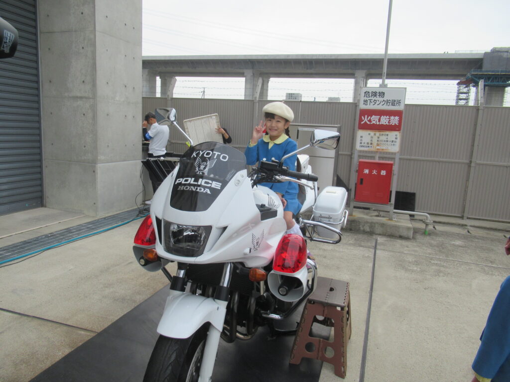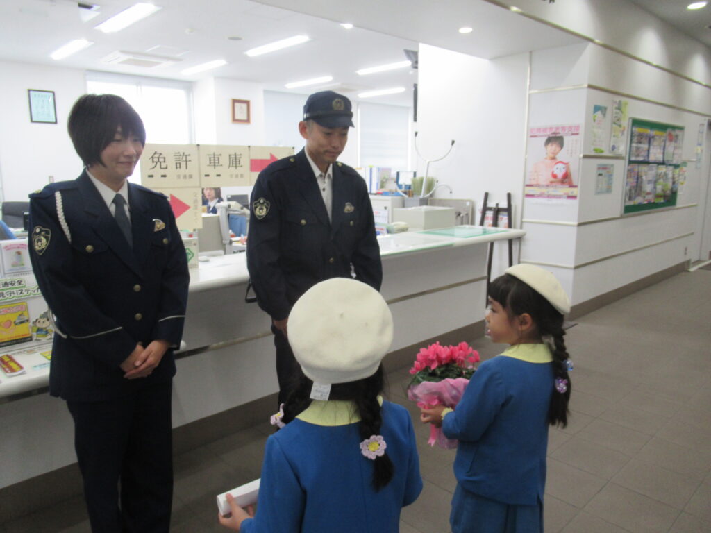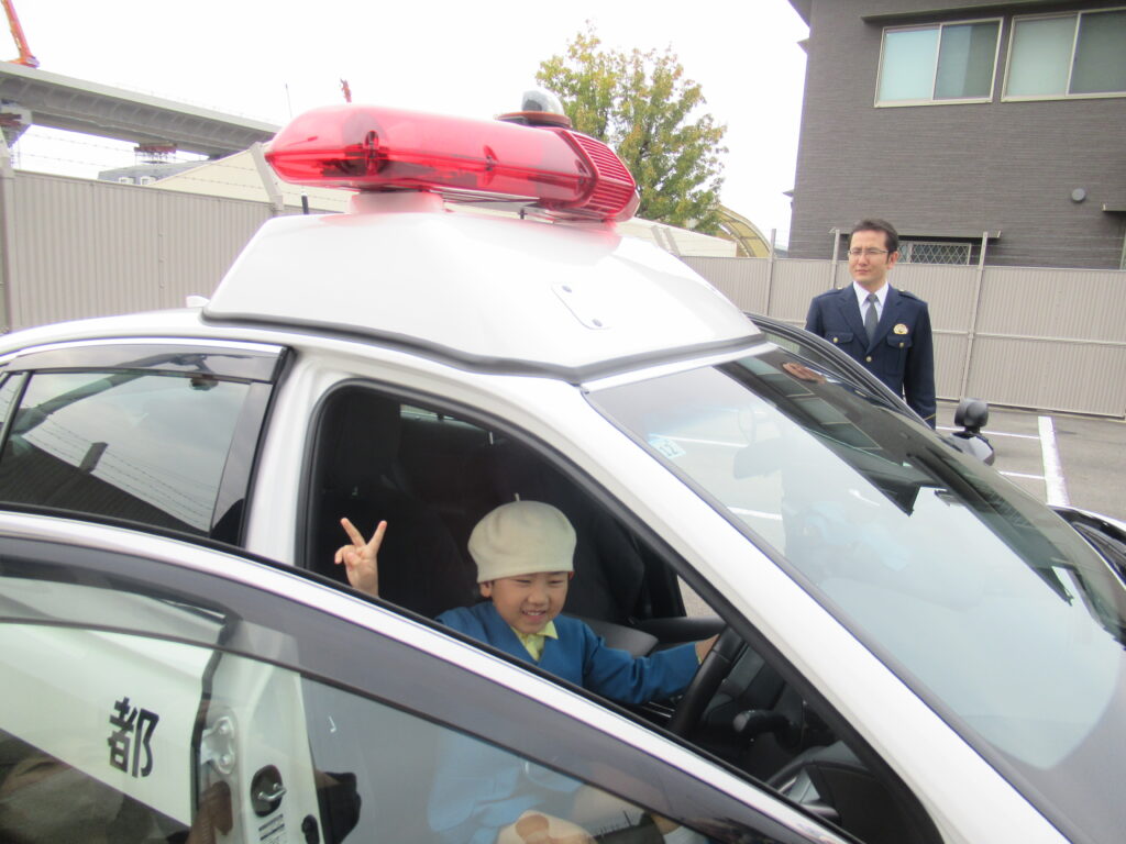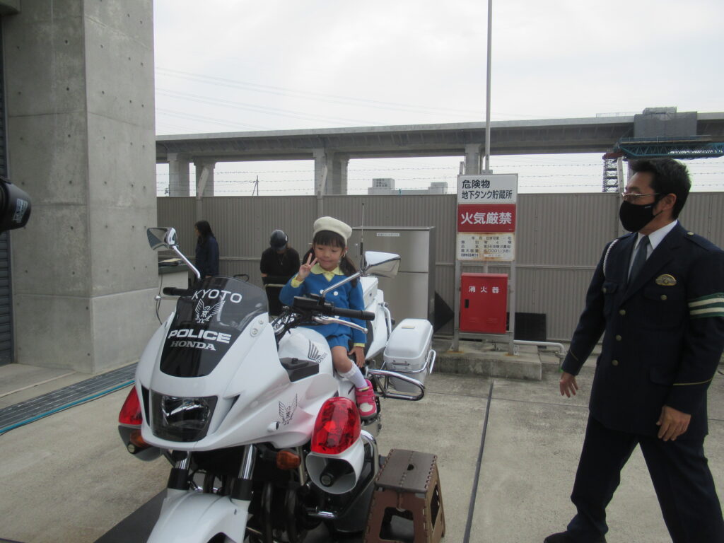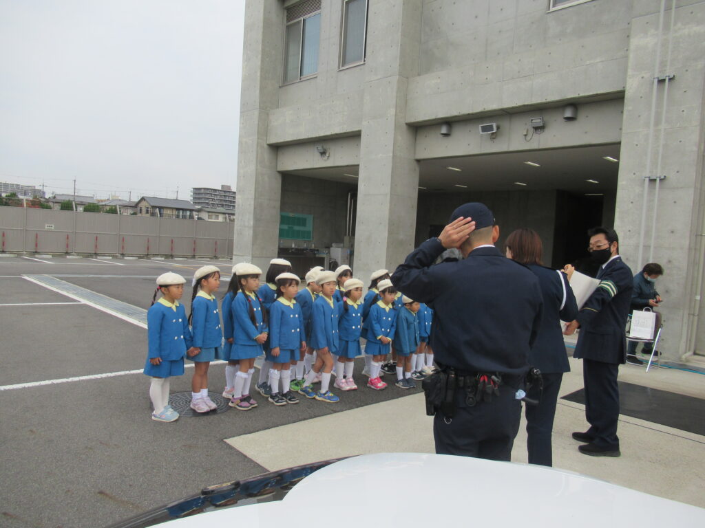 後ろに立っておられるのが、署長さんです!京都白鳥幼稚園出身だそうで、「もも組、さくら組知ってるよ」とお話してくださり、「え~、一緒やん!」と!! 親近感がわいて子ども達もにこにこでした😃