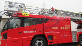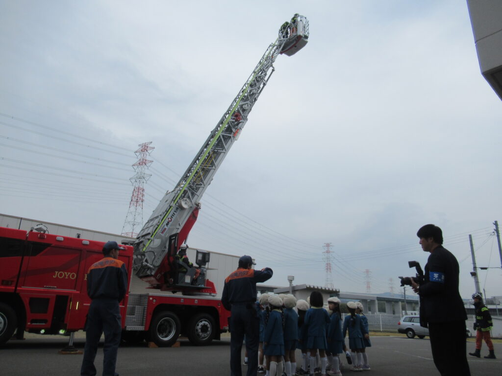 子ども達のために、実際にはしごがどれくらい上がるか見せてくださいました。「何メートル上がると思う?」の質問に、「5メートル!」「10メートル!」「30メートル!」と答えると、「30メートル上がります!!」ということを教えてもらいました。「すごいー!」「まだまだ高く上がっていくー!!」と大歓声☆ まじかで見ると迫力がすごかったです。