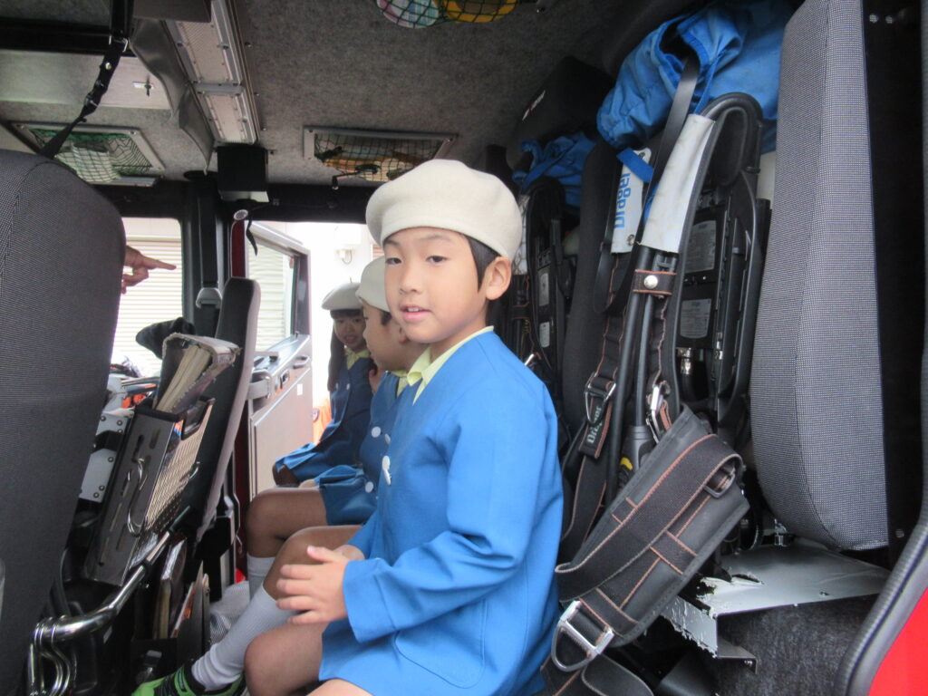 次は、消防署です!🚒 大きなはしご車を見て大興奮👀