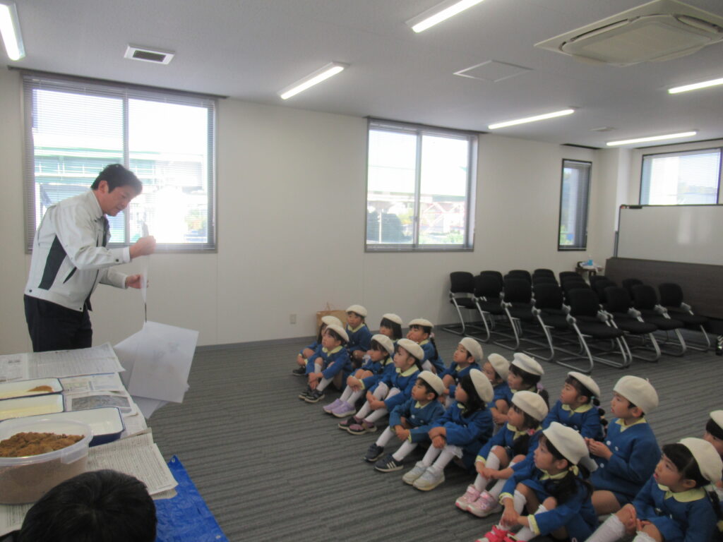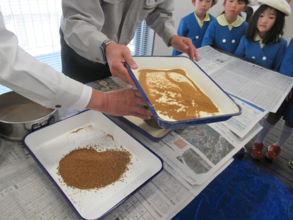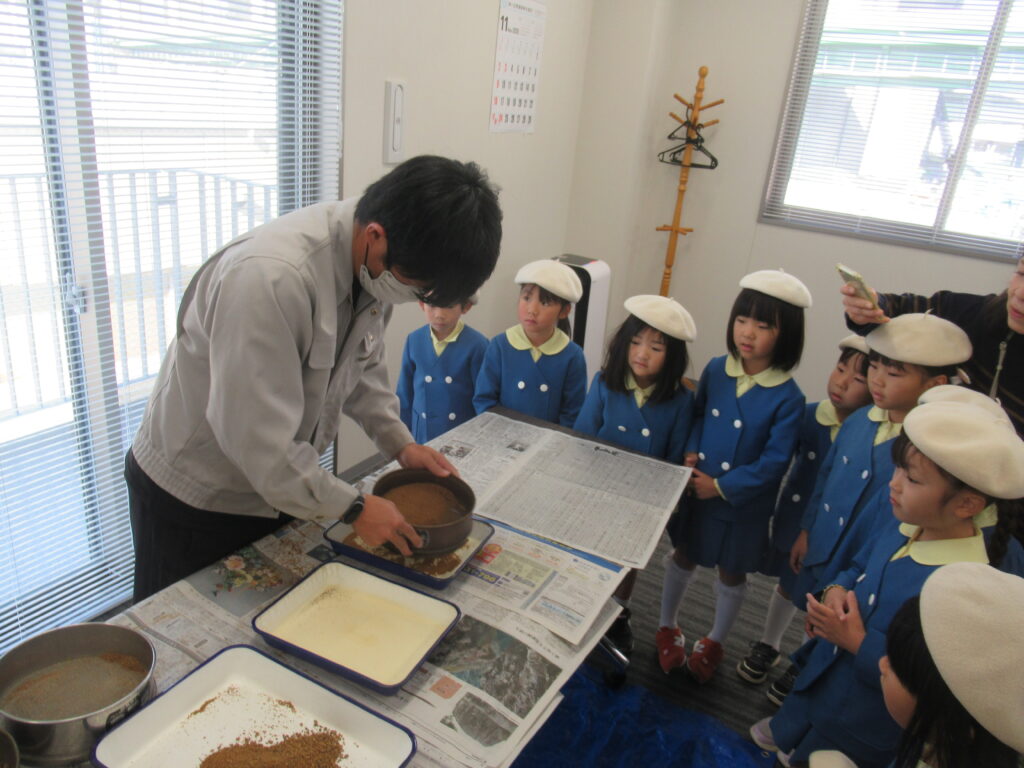 最後の近畿砂利協同組合では、「砂」は重要な資源であるということを教わりました。そして、実際に砂をふるってどんどん細かくなっていく様子を見させていただきました。「ツルツルになってきた!」「きなこみたい!」と声があがりましたよ。